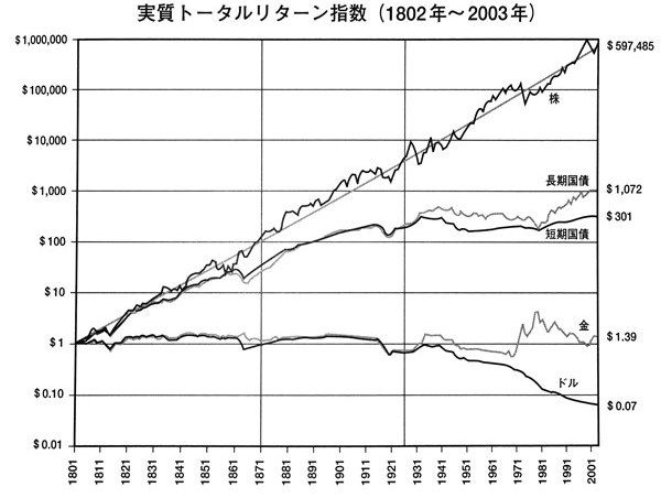 見て分かるように、株式は約200年で約60万倍、(長期)国債は1000倍、現金の価値は10分の1以下になっています。