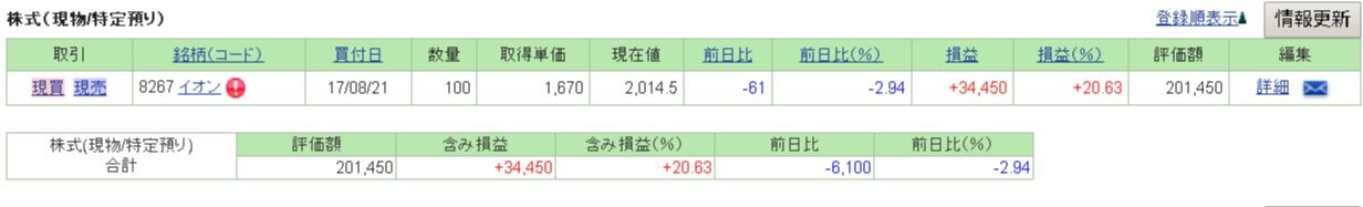 値上がり狙いでも配当狙いでもなく(もちろん、上がってくれれば言うことなしですが)、最も利用するスーパーマーケットがイオン系列なためオーナーズカードが欲しくて購入しました。