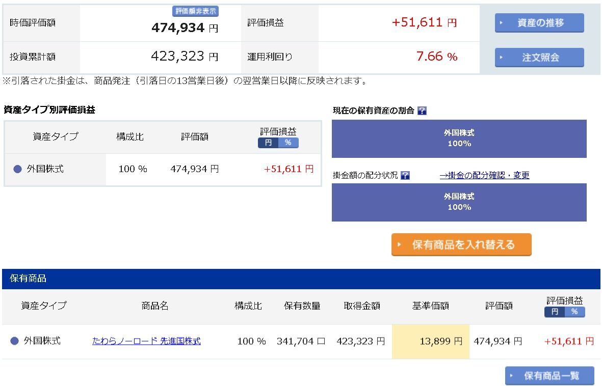 楽天証券を利用、積立は相も変わらず「たわらノーロード 先進国株式」一本です。