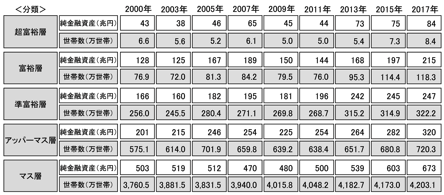 これはその人が保有している金融資産の額によって階層別けされており、保有している記入資産の合計額から負債を引いた額によって、以下のようになっています。