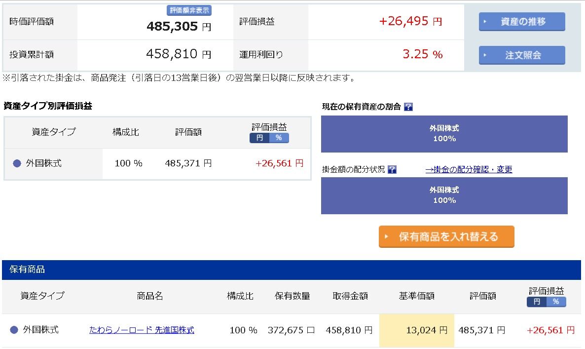 楽天証券を利用、積立は相も変わらず「たわらノーロード 先進国株式」一本です。