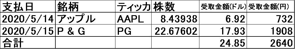 2020年5月の配当金額です。5月はわずかに2社でした。